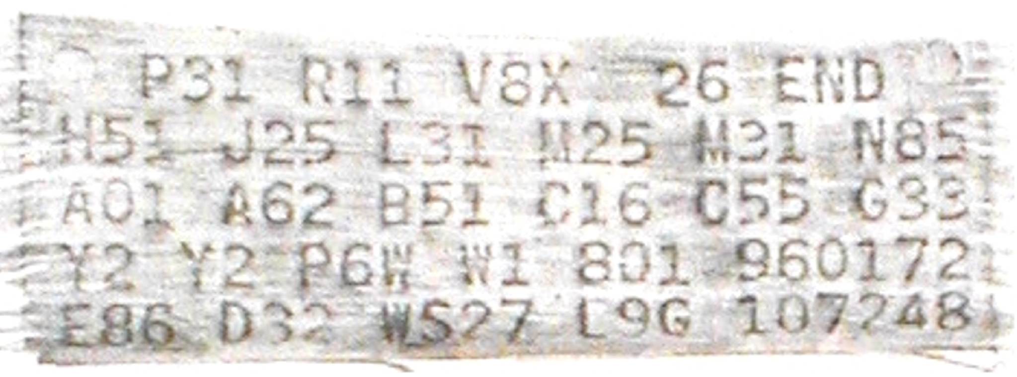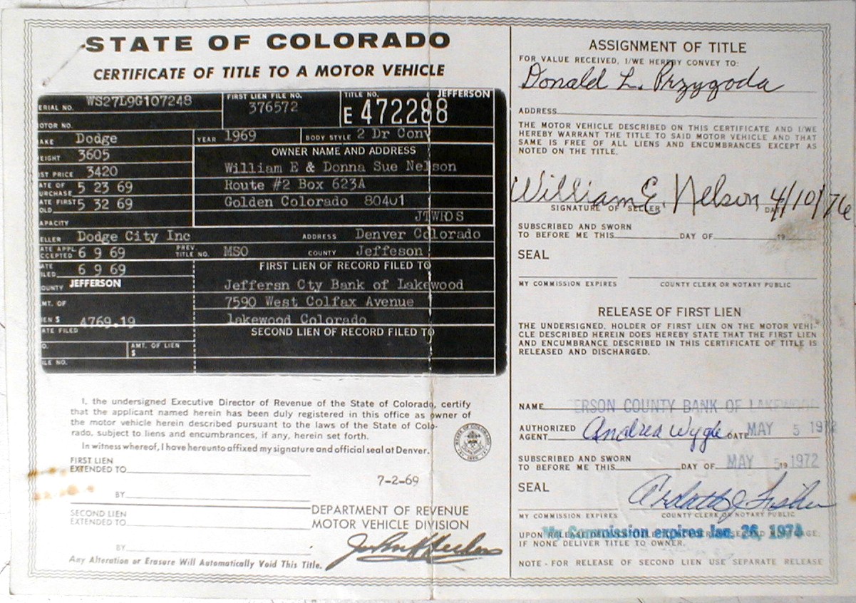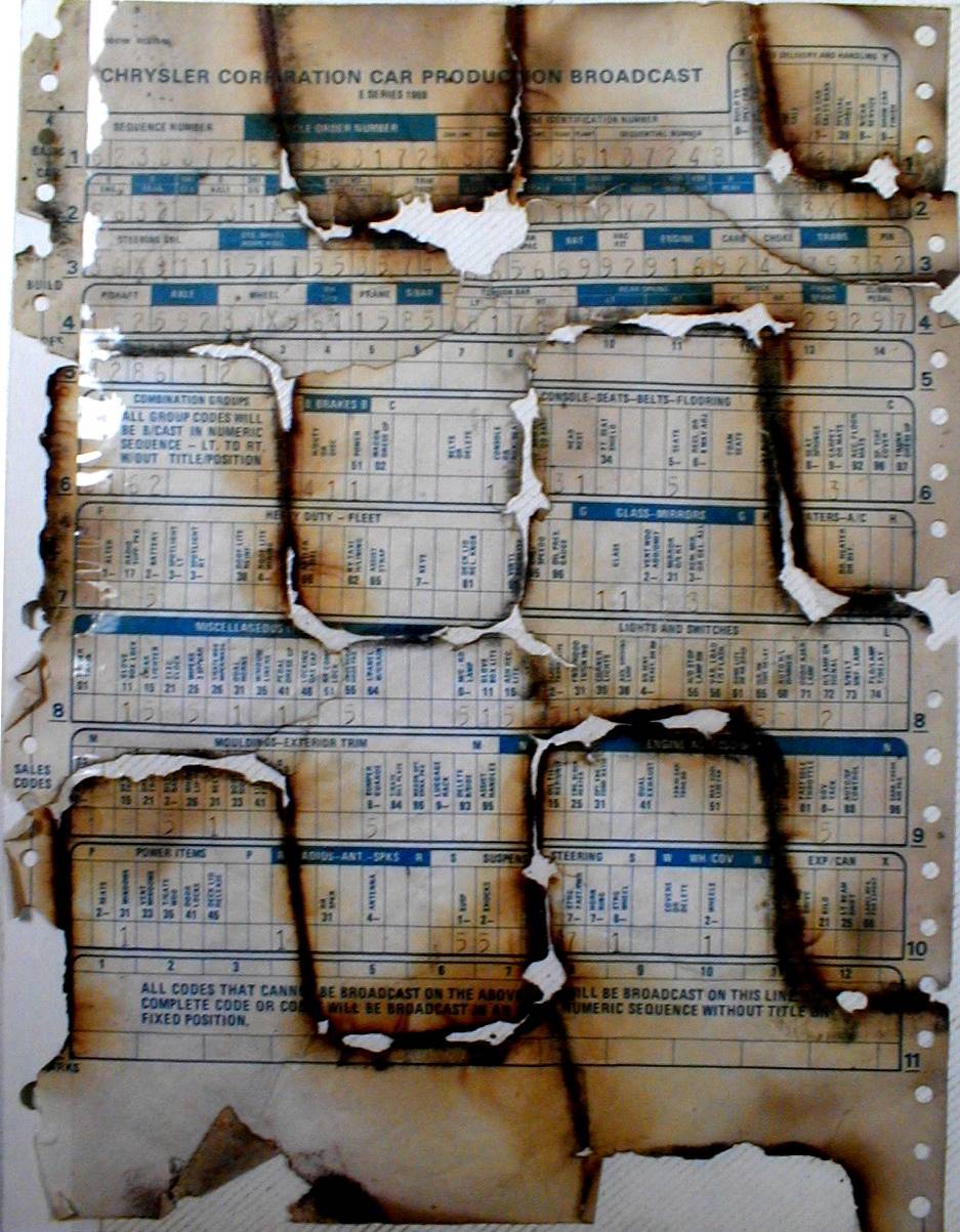 Vehicle Order Number - 960172 - Ordered as a "Show Car" G - St. Louis, MO manufacturing plant Y16 - Sales Bank E86 - 440ci HP engine 375HP D32 - A727 3-Speed automatic transmission D53 - 3.23:1 ratio 8 3/4" rearend D91 - Sure-Grip rearend T83 - F70 X 14 Red Side Wall tires Y2 - Sunfire Yellow paint V3X - Black convertible top V8X - Black transverse tape stripe A01 - Light Package A62 - Rallye instrument cluster B41 - Front disc brakes B51 - Power brakes C16 - Console C31 - Head restraints - left & right C55 - Bucket seats C93 - Carpeting F11 - 50 amp alternator F25 - 70 amp hour HD battery with red caps G11 - Tinted glass G33 - Left hand outside chrome remote mirror H51 - Air conditioning with front heater J11 - Glove box lock J15 - Cigar lighter J25 - 3-Speed variable wipers J31 - Dual horns J41 - Pedal dress up J55 - Undercoat with hood pad L05 - Map/courtesy lamp L11 - Glove box lamp L15 - Ash receiver lamp L25 - Trunk compartment lamp L31 - Fender mounted turn signal lamps L65 - Ignition switch lamp with timer L72 - Headlamp on buzzer M25 - Body sill mouldings (rocker panel) M31 - Body belt mouldings (upper door) M85 - Front & Rear bumper guards N85 - Tachometer P31 - Power windows R11 - 2 watt AM Music Master radio S15 - HD/Hemi suspension S25 - HD shock absorbers front & rear (1") S77 - Power steering S81 - Woodgrain sport steering wheel W21 - Magnum 500 Class II road wheel