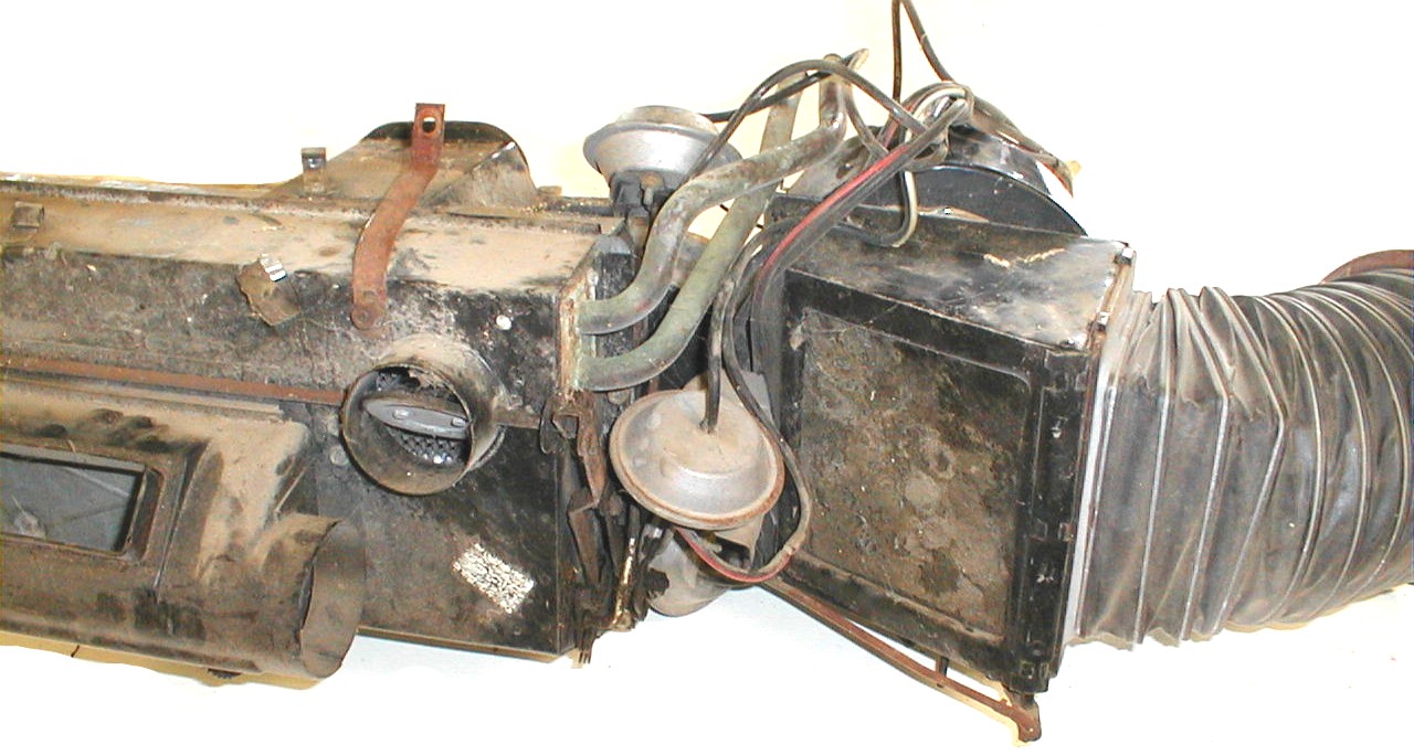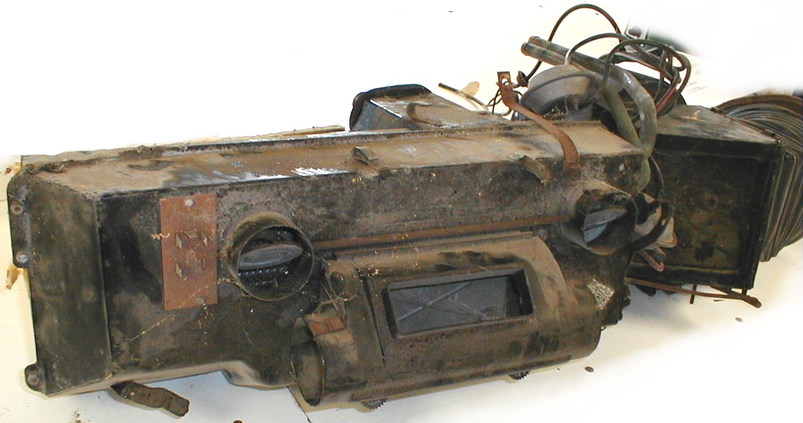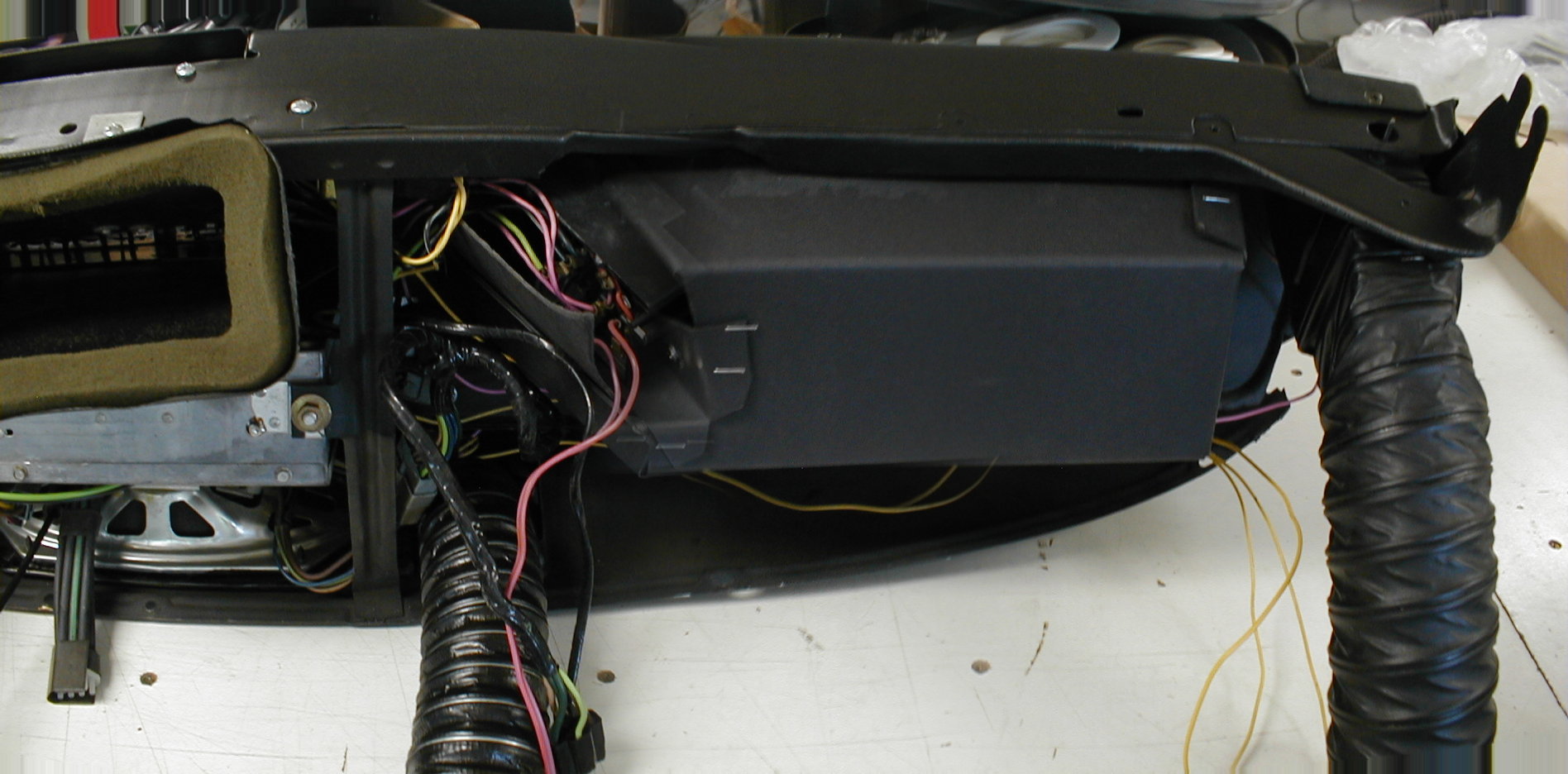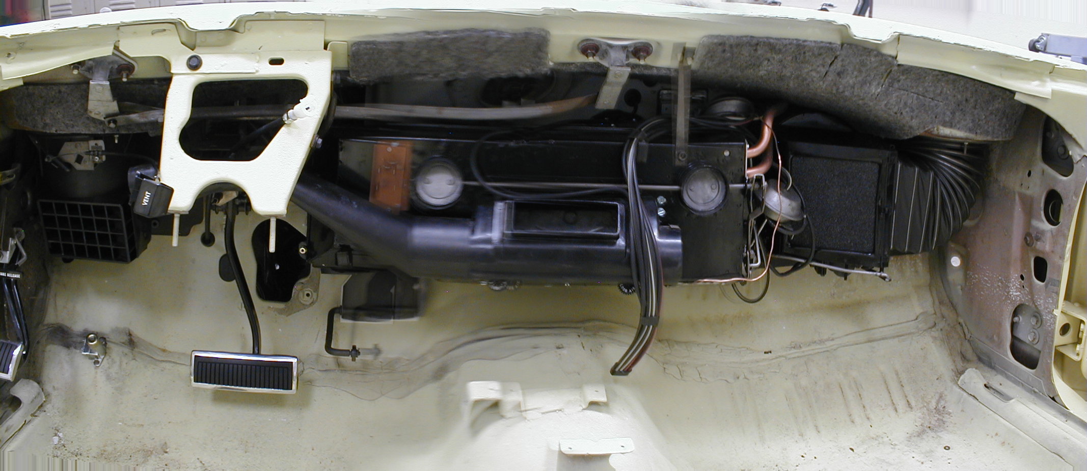 The original interior was tired from exposure but not due to wear. All original components were filmed during disassembly and fasteners were bagged and tagged for later assembly. The A/C and heater box was a huge task. After complete documentation of the original components and placement, disassembly began. The heater core and evaporator were pressure checked for leakage. An NOS heater control valve was installed with new o-rings. The halves of the metal heater box were stripped and re-dipped in chassis black enamel. All natural metal components were acid dipped and then coated with a wax based corrosion inhibitor. New gaskets were fabricated for the vent doors. All fasteners were plated to proper original specification in either zinc or zinc dichromate. An NOS vacuum harness was installed. The fan motor was fully disassembled and restored to concours status.