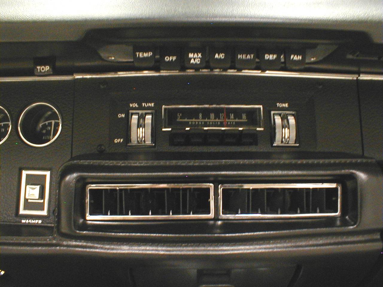 The original instruments were re-faced and the tachometer was calibrated. The original clock was cleaned and continues to function. All instrument panel plastic was vacuum metallized and detailed to match original appearance. All gauges and switches function. Radio speaker replaced and DODGE AM radio functions correctly. All but one of the heater control buttons is NOS. The center A/C vent is also NOS. Original steering wheel was cracked and replaced with a very nice unit with plenty of wood grain ticking and no cracks. A new glove box liner has been installed and the paint "OK" inspection mark placed in the proper location.