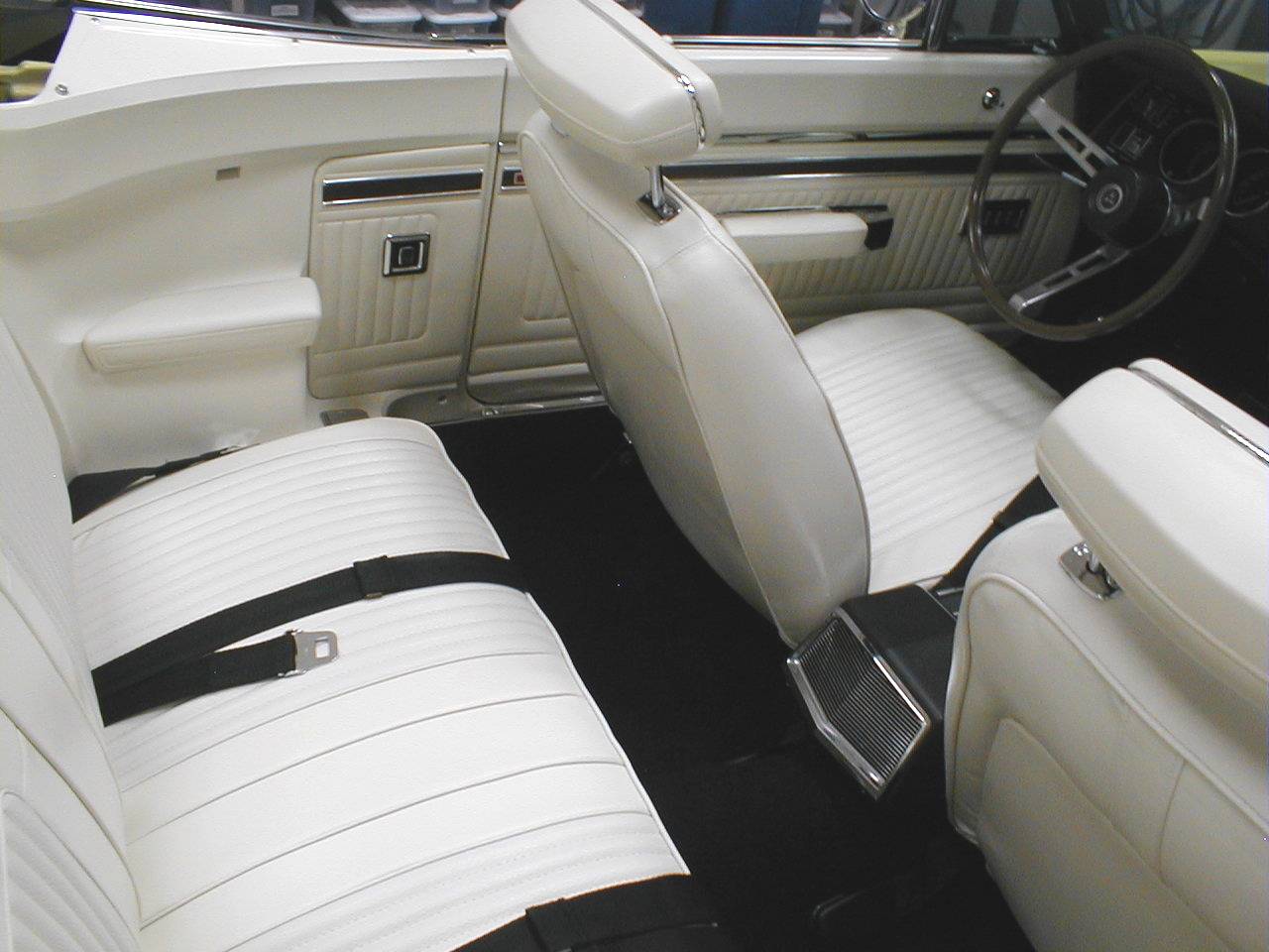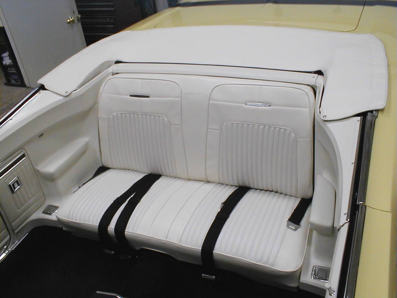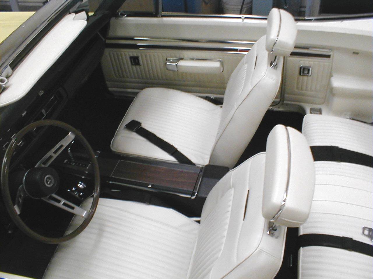 The seat assemblies were completely disassembled and the frames were stripped to bare metal. Chassis black enamel was applied to all seat frames and springs. Bottom of back seat was treated to new cotton batting and burlap. The front seats also were treated to new burlap and the springs woven through as original. All seat foam was in good shape. All seats were covered in Legendary Interiors reproduction seat covers with the correct grain and color. Head rests were restored and dyed to match interior. Seat hinge covers are original and restored with SEM vinyl dye. A six way seat mechanism was added to the driver seat which is NOT original. The mechanism was fully stripped and detailed in chassis black enamel. Both chrome knobs are in excellent condition. All seat belts are original and in great condition. They were fully cleaned and restored to original appearance. Seat belt hardware was plated in zinc or zinc dichromate as original. Carpet is correct black loop with premium heel pad on drivers side. New reproduction door sill plates were installed. Rear carpet trim bezels were restored.