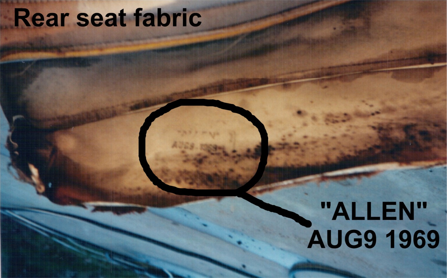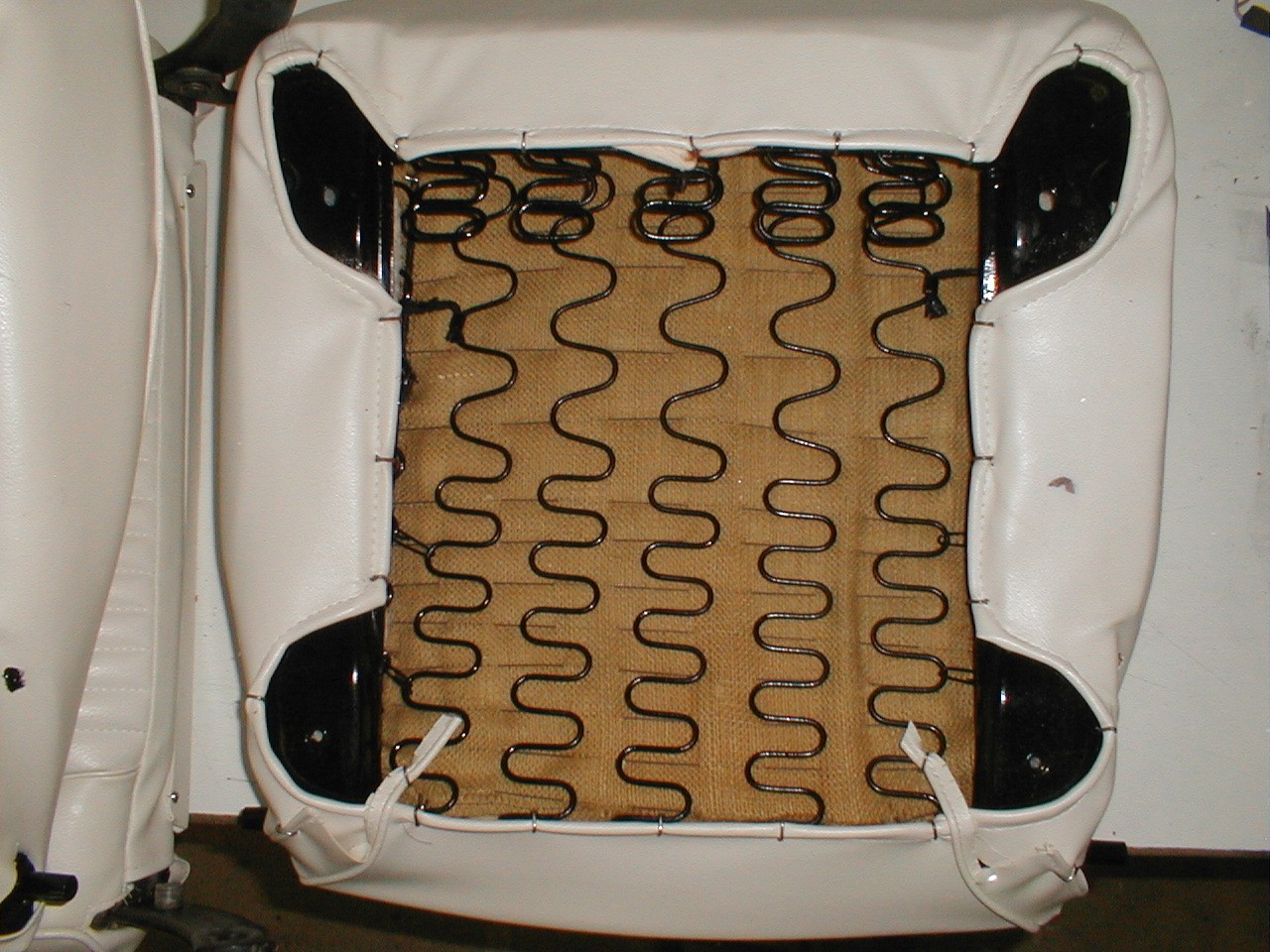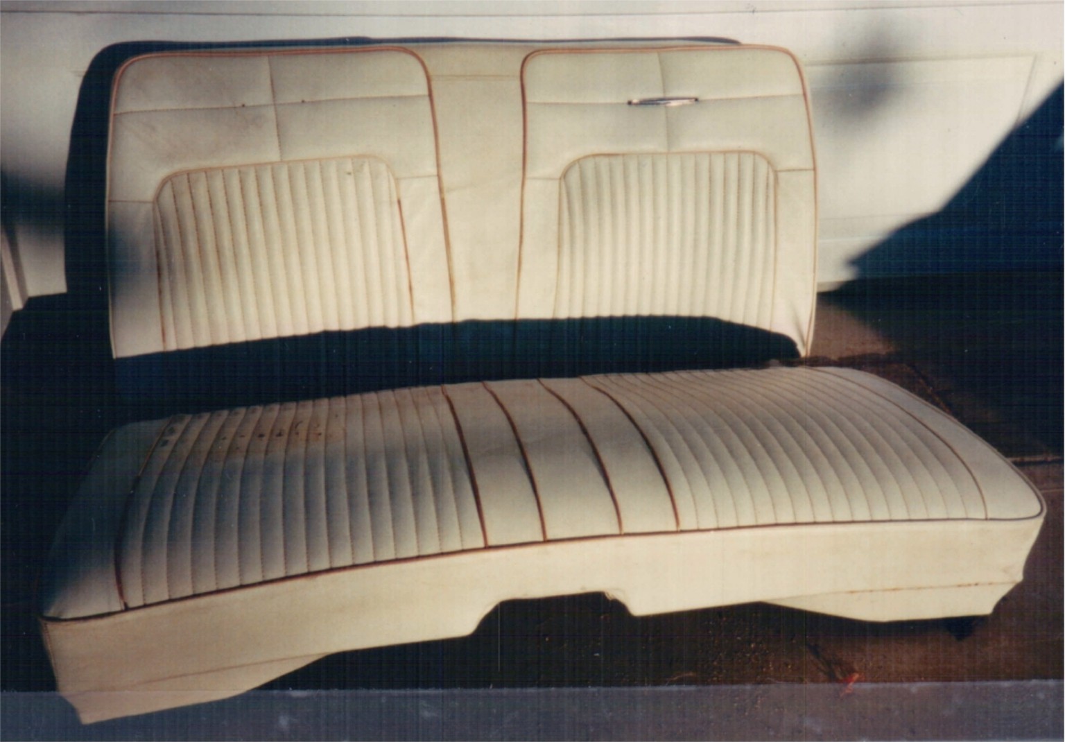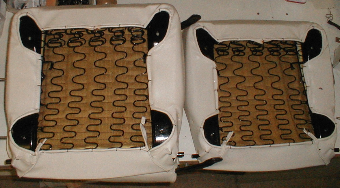 The seat assemblies were completely disassembled and the frames were stripped to bare metal. Chassis black enamel was applied to all seat frames and springs. Bottom of back seat was treated to new cotton batting and burlap. The front seats also were treated to new burlap and the springs woven through as original. All seat foam was in good shape. All seats were covered in Legendary Interiors reproduction seat covers with the correct grain and color. Head rests were restored and dyed to match interior. Seat hinge covers are original and restored with SEM vinyl dye. A six way seat mechanism was added to the driver seat which is NOT original. The mechanism was fully stripped and detailed in chassis black enamel. Both chrome knobs are in excellent condition. All seat belts are original and in great condition. They were fully cleaned and restored to original appearance. Seat belt hardware was plated in zinc or zinc dichromate as original. Carpet is correct black loop with premium heel pad on drivers side. New reproduction door sill plates were installed. Rear carpet trim bezels were restored.