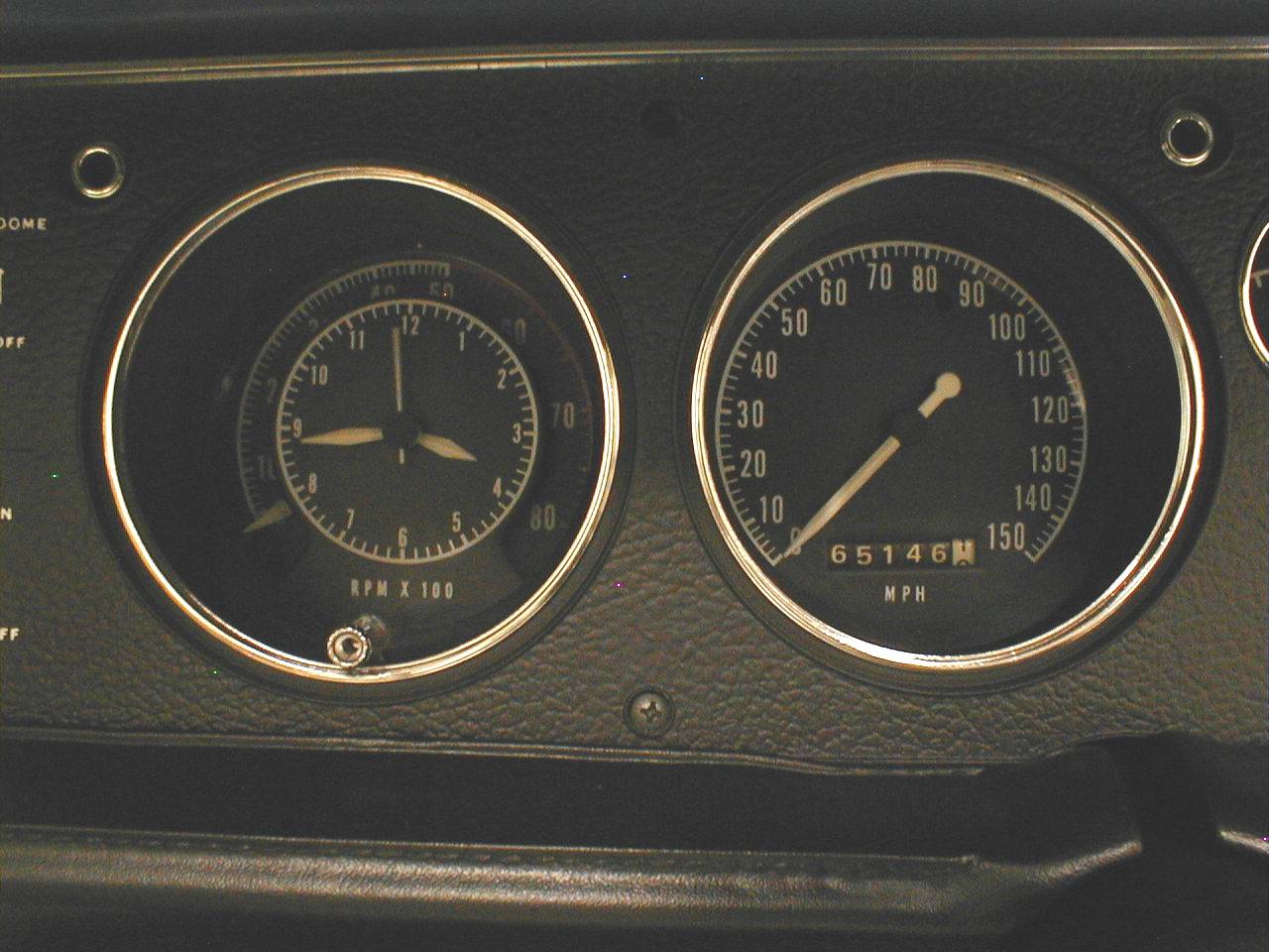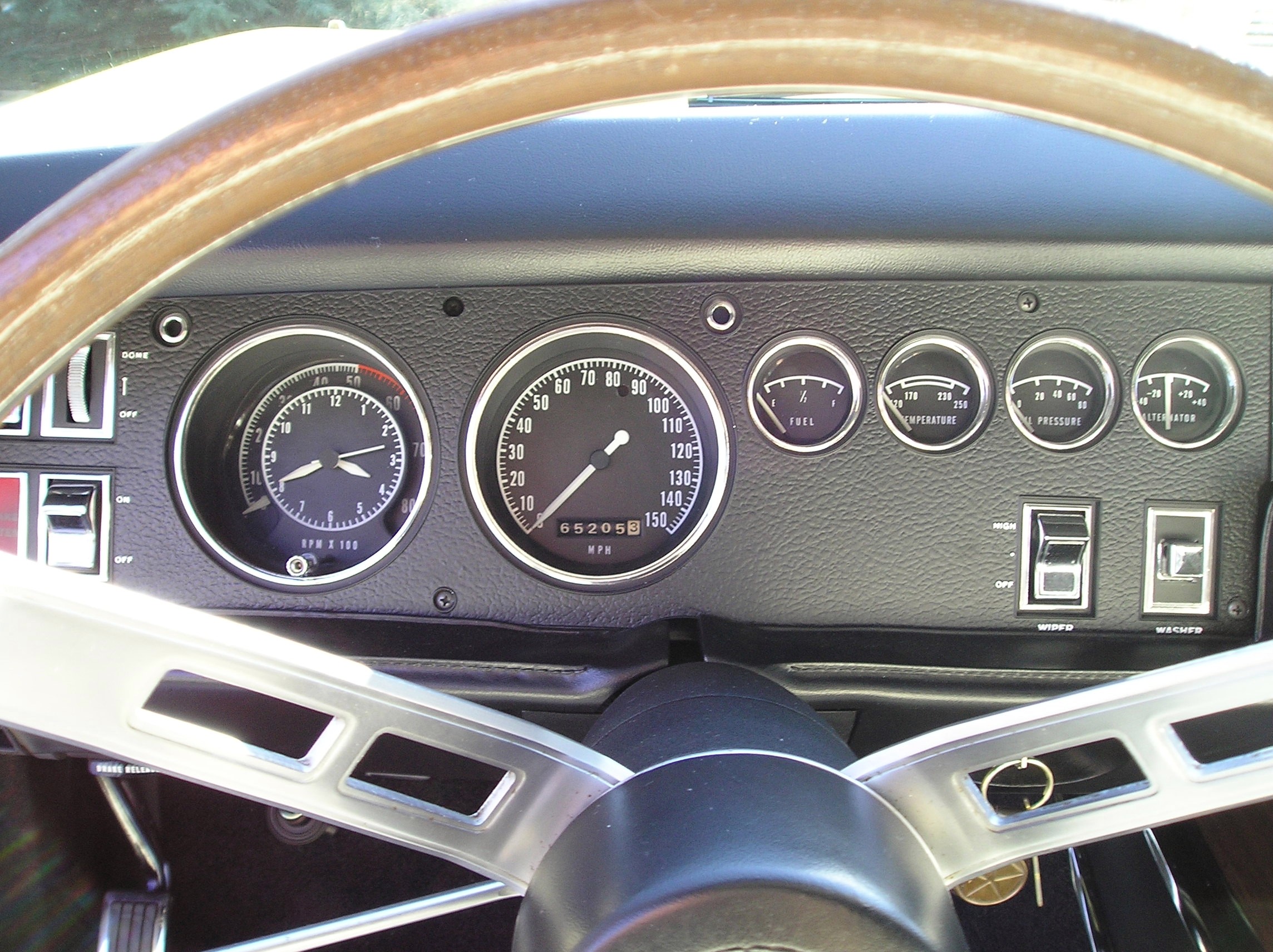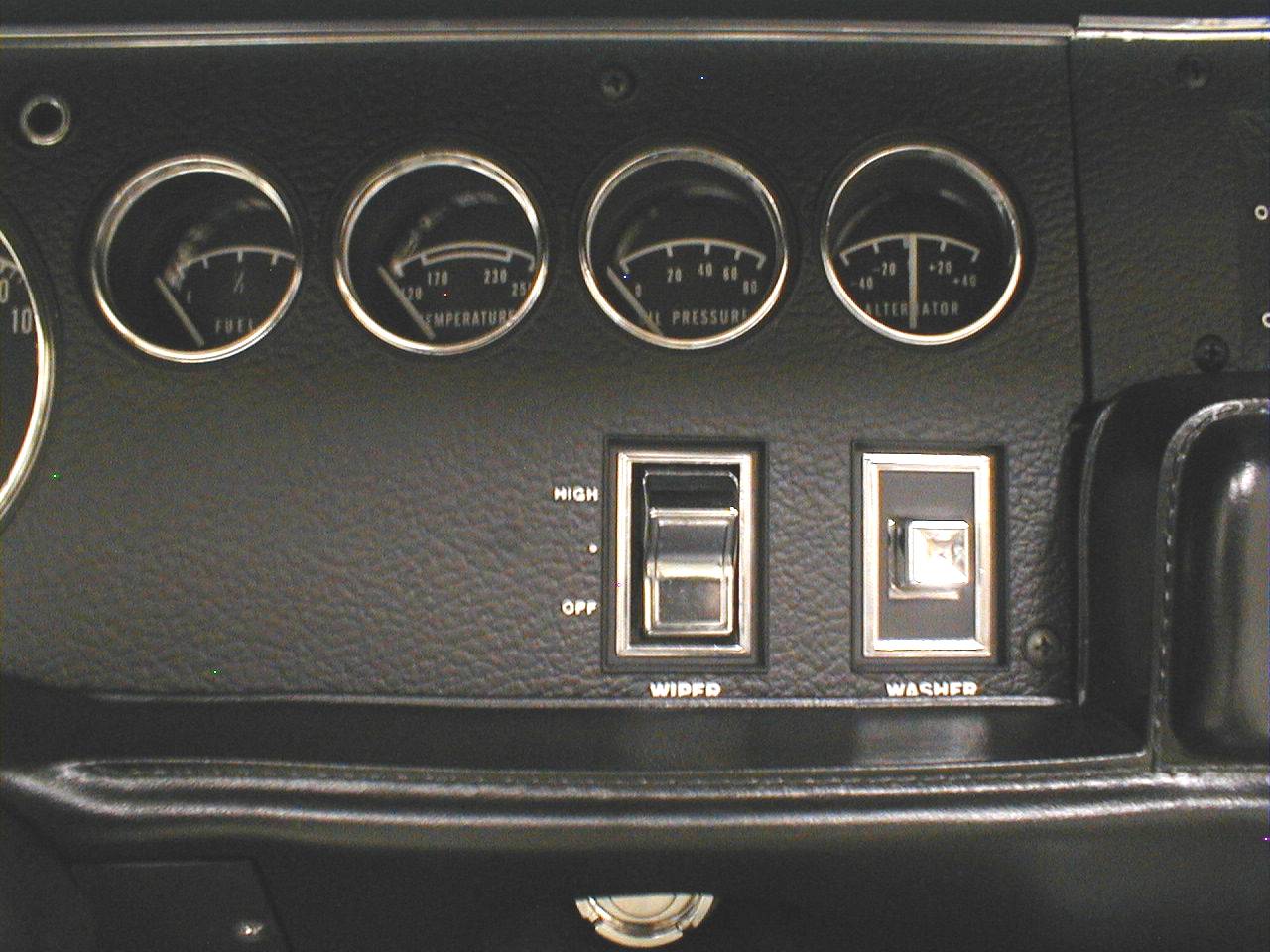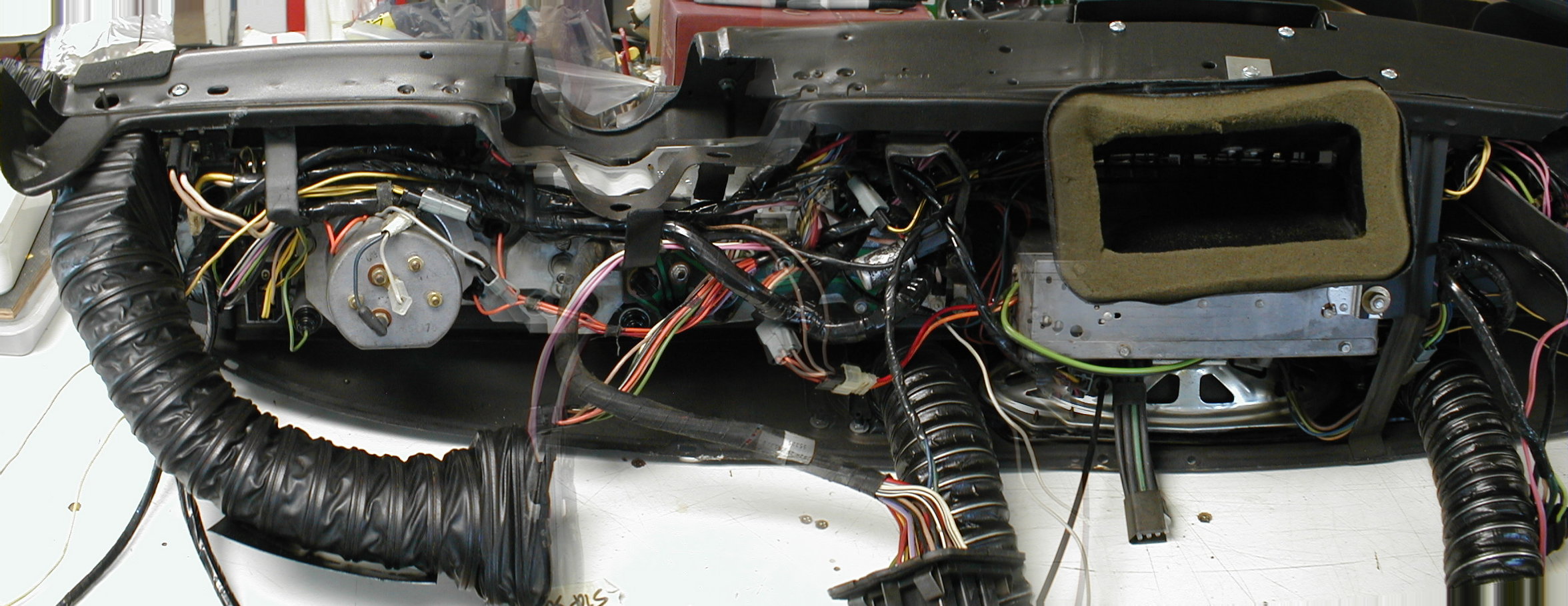 Complete dash frame assembly was stripped and sprayed with correct jewel black. All soft pads were cleaned and sprayed with SEM black vinyl dye to provide a coordinated color appearance. The same SEM was applied to the A-pillar covers, kick panels, and console plastic. All instrument wiring was cleaned and checked for wear. Complete dash was assembled on bench then installed as a unit.