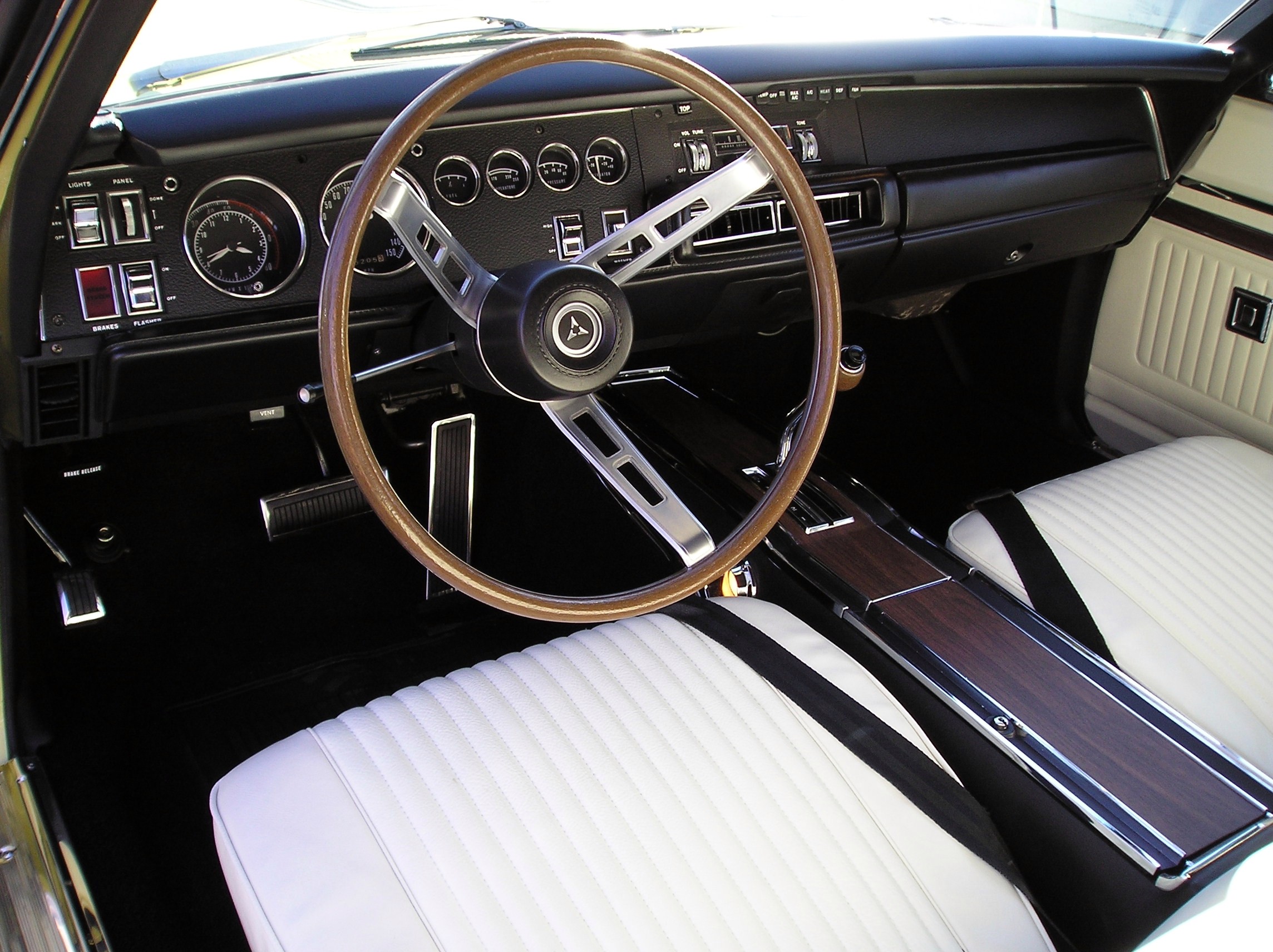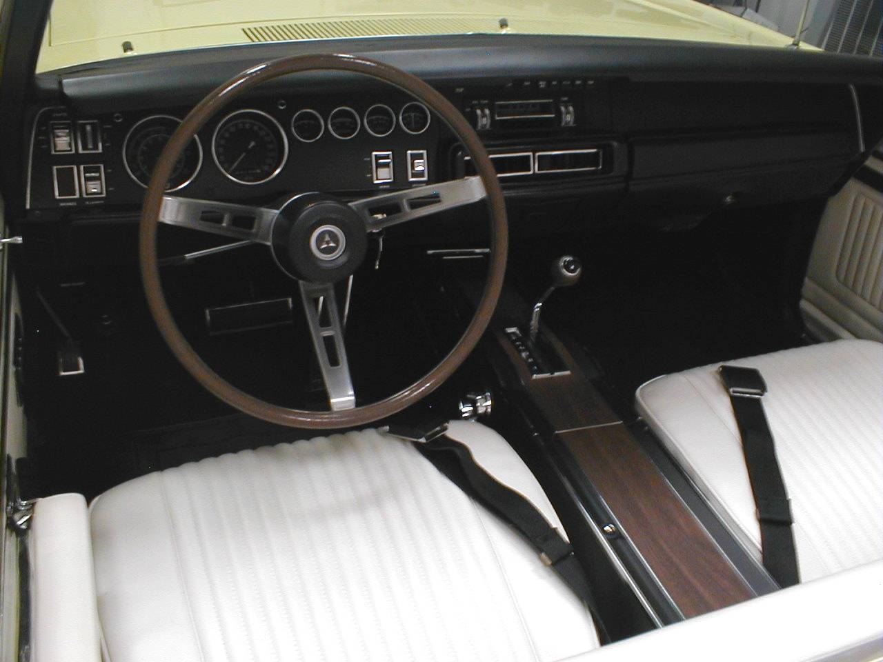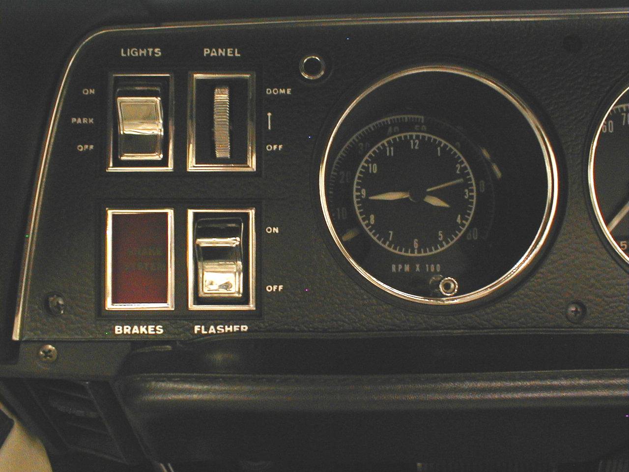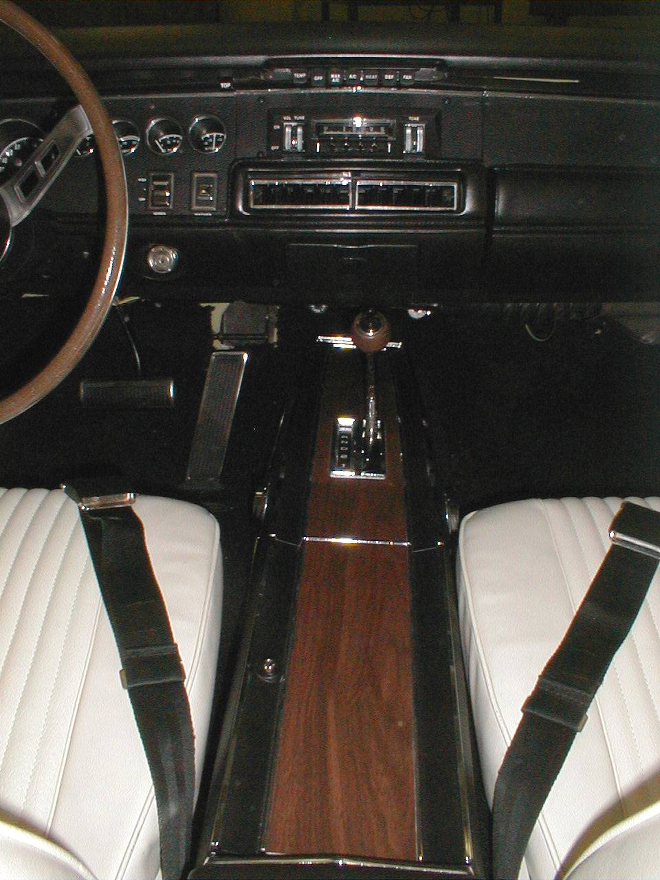 The center console was fully restored with new woodgrain center and black surround. Console plastic was restored with black SEM vinyl dye. A new woodgrain shift ball and NOS button were installed. Shifter mechanism was fully detailed stripped and coated with a wax based corrosion inhibitor. All carpet accents were replaced with new reproduction pieces.