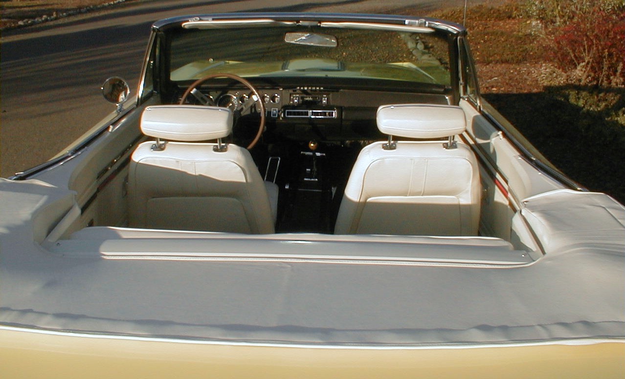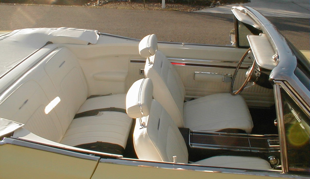 Original sun visors were restored with SEM vinyl dye and original top latch bezels are in excellent condition. Convertible only inside rearview mirror is also excellent.