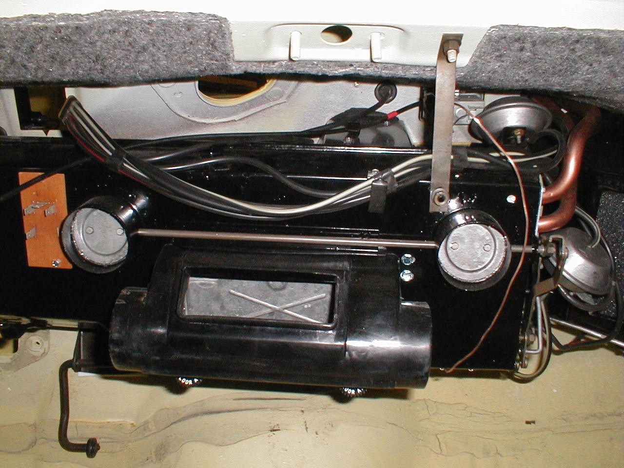The original interior was tired from exposure but not due to wear. All original components were filmed during disassembly and fasteners were bagged and tagged for later assembly. The A/C and heater box was a huge task. After complete documentation of the original components and placement, disassembly began. The heater core and evaporator were pressure checked for leakage. An NOS heater control valve was installed with new o-rings. The halves of the metal heater box were stripped and re-dipped in chassis black enamel. All natural metal components were acid dipped and then coated with a wax based corrosion inhibitor. New gaskets were fabricated for the vent doors. All fasteners were plated to proper original specification in either zinc or zinc dichromate. An NOS vacuum harness was installed. The fan motor was fully disassembled and restored to concours status.