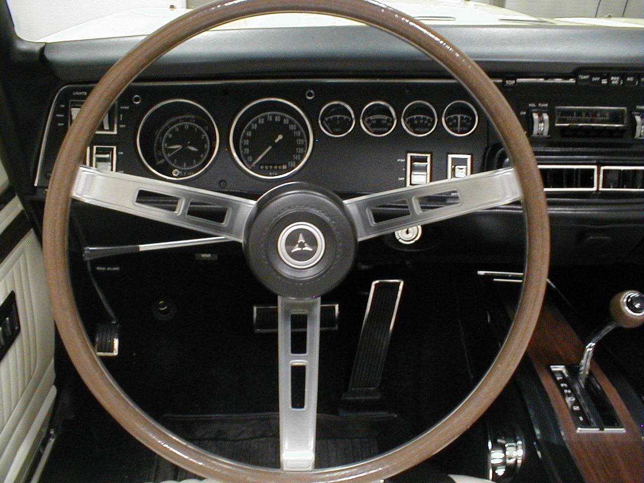 The original instruments were re-faced and the tachometer was calibrated. The original clock was cleaned and continues to function. All instrument panel plastic was vacuum metallized and detailed to match original appearance. All gauges and switches function. Radio speaker replaced and DODGE AM radio functions correctly. All but one of the heater control buttons is NOS. The center A/C vent is also NOS. Original steering wheel was cracked and replaced with a very nice unit with plenty of wood grain ticking and no cracks. A new glove box liner has been installed and the paint "OK" inspection mark placed in the proper location.